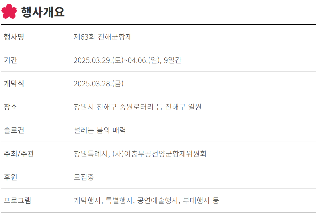 2025 진해군항제는 단순한 벚꽃 축제를 넘어, 다양한 문화적 요소를 체험할 수 있는 소중한 기회입니다. 다가오는 2025년 따스한 봄날에 소중한 가족, 친구, 연인과 함께 추억을 쌓아가셨으면 좋겠습니다. 더욱 다채롭고 특별한 경험이 기다리고 있으니 많은 분들이 함께 참여하여 아름다운 진해의 봄을 만끽하시기 바랍니다. 🌸💖